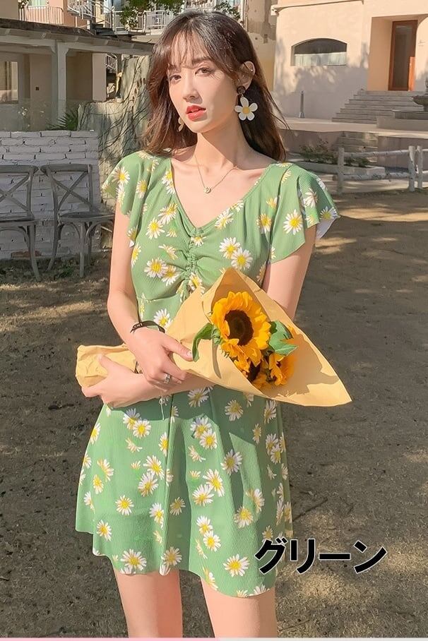 【送料無料】3色 水着 ワンピース レディース l 花柄 パステル 大人 エレガント 袖付き 体型カバー フローラル フラワー シャーリング フレア フリル ブラウス ワンピース水着 温泉 韓国風 Vネック上品 大きいサイズ XL 2XL 3XL 黄色 青 緑 イエロー ブルー グリーン リゾート コーデ プール 海 バカンス ハッション 日焼け防止 二の腕 お腹 脚 カバー