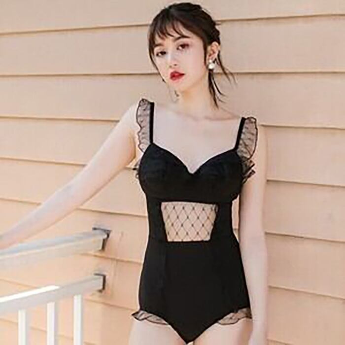 【送料無料】 水着 ワンピース セクシー l ワイヤー 体系カバー レース フリル バックシャン 胸元 谷間魅せ 盛れる セクシー シンプル 大人っぽい 無地 20代 30代 レディース 女性 体系カバー デート 海 プール リゾート 色 ブラック サ