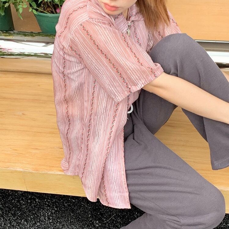 【送料無料】 小花柄 半袖 シャツ l ミディアム丈 袖あり 襟付き 前開き 綿 かわいい 大人可愛い カジュアル 大人 おしゃれ お洒落 大人女子 ルーズ 個性的 柄 花柄 フラワー ストライプ シマ 夏 10代 20代 レディース 通勤 学生 通学 デート お出かけ 女子会 休日 旅行 着回し 普段使い 重ね着 韓国 韓国系 オルチャン ゆったり サイ