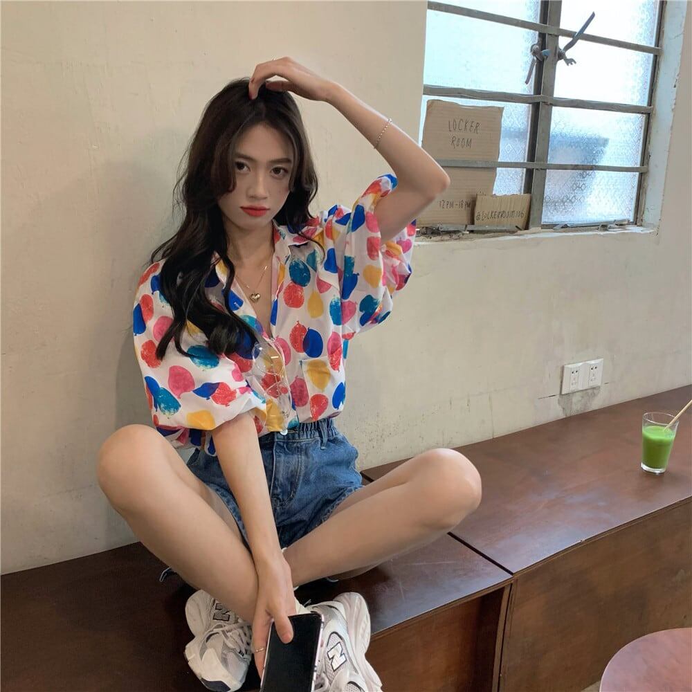 【送料無料】半袖 ブラウス シャツ レトロ l ドット柄 個性的 カラフル トップス レディース 夏 襟付き インパクト バルーン ポップ かわいい ラフ ゆったり 着回し 可愛い ホワイト 白トップス ワンサイズ フリーサイズ 春 夏 スプリング サマー おしゃれ デート 大人可愛い お出かけ 存在感 こなれ感 抜け感 女子会 普段使い デイリー使い 休日 主役級 インスタ映え 韓国ファッション 海外トレンド 大人気 高見え 流行 10代 20代 30代 プチプラ