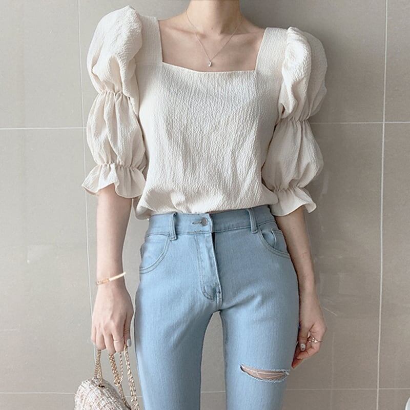2段になったパフスリーブがキュートなブラウス。