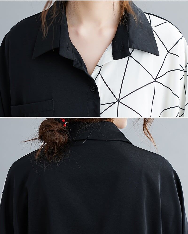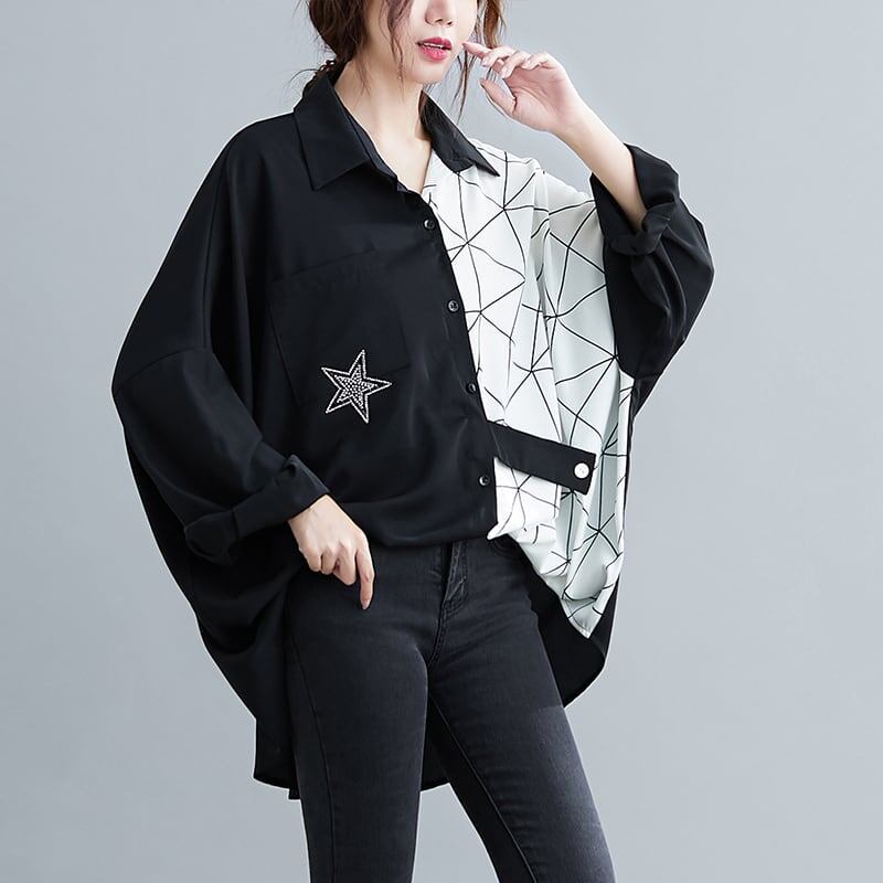 【送料無料】ロング シャツ ブラウス 黒 l アシンメトリー 個性的 長袖 トップス バイカラー 星 スター ゆる クール ビックシルエット ゆったり カッコイイ レトロ 襟付き プルオーバー スタイリッシュ レディース M 大きいサイズ L XL 2XL ブラック ホワイト 春 秋 冬 おしゃれ お出かけ 存在感 こなれ感 抜け感 女子会 普段使い デイリー使い 休日 主役級 インスタ映え 韓国ファッション 海外トレンド 大人気 高見え 流行 10代 20代 30代 40代 プチプラ