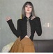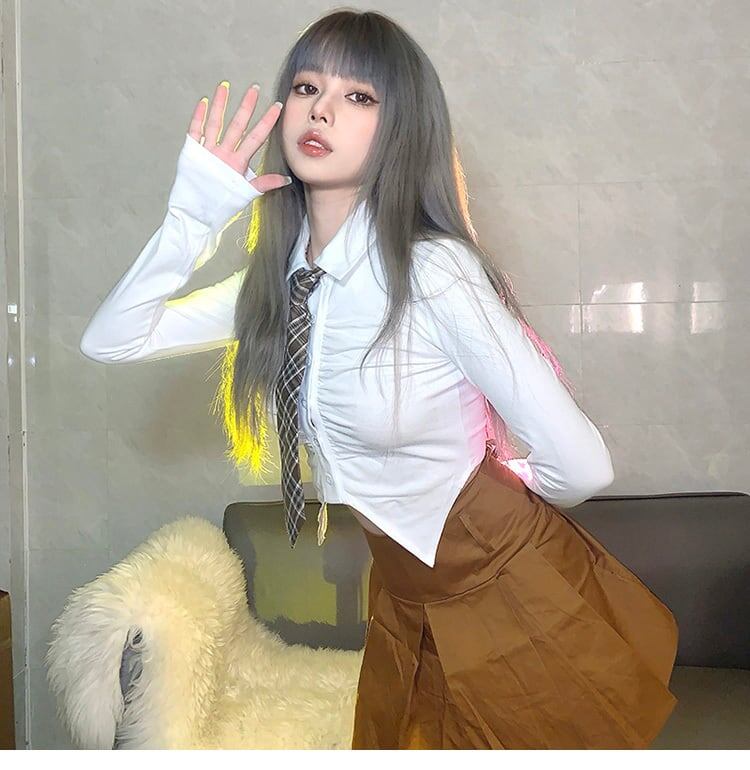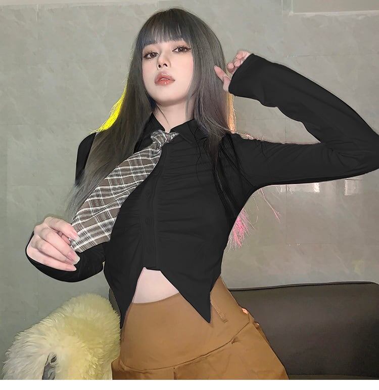 【送料無料】 2色 ブラウス シャツ l 黒 ネクタイ ミニ丈 へそ出し 肌見せ セクシー 制服風 スクール風 トップス 春 秋 長袖 ショート丈 かわいい チェック フロントギャザー ヘムカット スクールコーデ 長袖 ポロカラー かわいい カジュアル お洒落 ラブリー キュート ガーリー 個性的 無地 春 夏 秋 冬 10代 20代 30代 レディース 韓国 コーデ 学生 通学 デート お出かけ 着回し 普段使い 重ね着 モテ 定番 トレンド 流行 海外 S M L XL