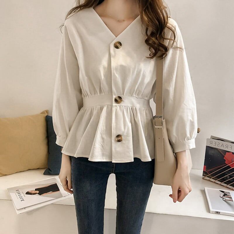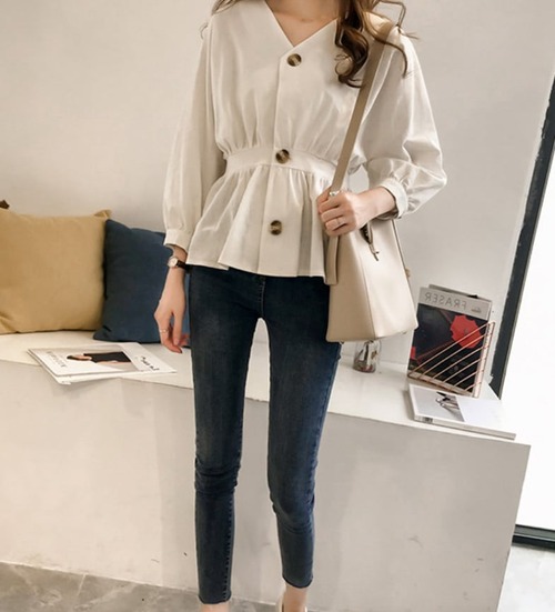 Vネックのペプラムブラウスシャツ