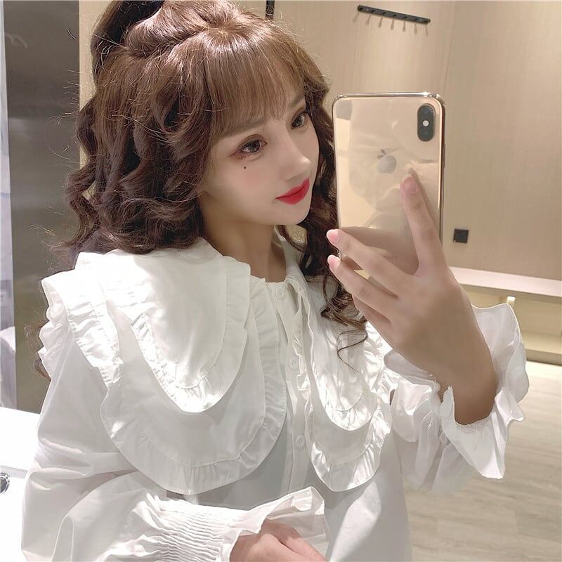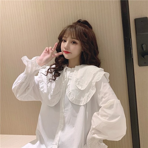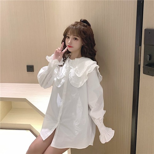【送料無料】2色 ロング シャツ ブラウス l ビッグカラー 萌袖 フリル カットソー 襟付き かわいい きれいめ おしゃれ カジュアル 韓国 春 トップス こなれ感 キュート ルーズ 個性的 白 水色 無地 主役級 存在感 ワンサイズ ホワイト ブルー 春 夏 秋 10代 20代 女の子 学生 通学 デート お出かけ 女子会 休日 普段使い お揃い 双子 韓国 韓国系 オルチャン ファッション モテ 体型カバー トレンド 流行 インスタ映え 白コーデ ホワイト シャツ 女性用 ロング丈