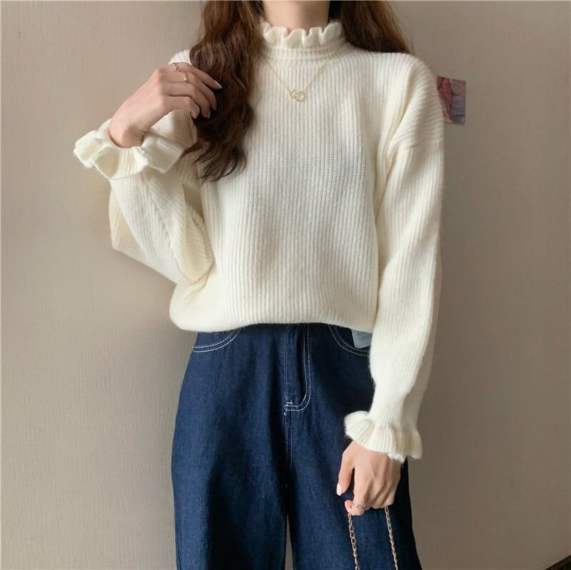 【送料無料】3色 セーター リブ タートルネック l 袖 無地 ニット トップス 長袖 レディース きれいめ 大人可愛い キュート ラブリー 萌袖 カジュアル ブルー ホワイト ピンク 青 白 春 秋 冬 カワイイ おしゃれ デート お出かけ 存在感 こなれ感 抜け感 ラフ 着回し ヘビロテ 定番 アイテム インスタ映え 韓国ファッション 海外 オルチャン スタイル トレンド フリルネック スタンドカラー 10代 20代 30代 40代 プチプラ