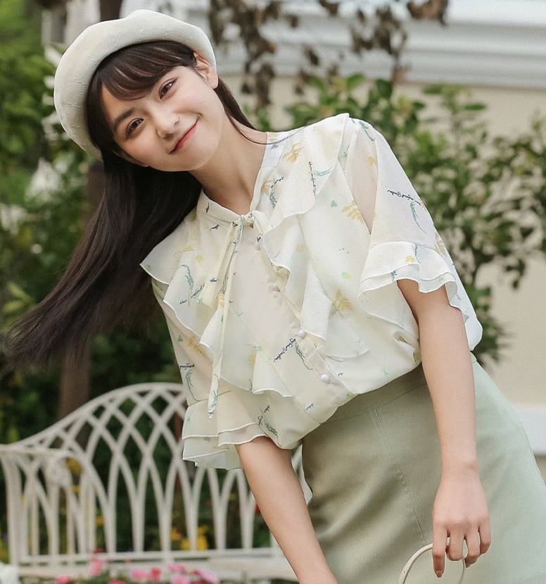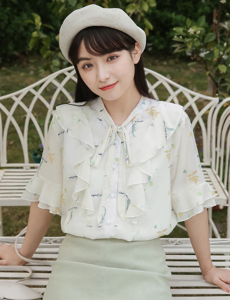 【送料無料】 フラワープリントフリルブラウス トップス ブラウス l 半袖 シフォン フリル リボン ポリエステル かわいい 大人可愛い シンプル カジュアル おしゃれ お洒落 ラブリー キュート ガーリー 個性的 主役級 柄 フラワー 春 夏 10代 20代 30代 レディース OL 通勤 学生 通学 デート お出かけ 女子会 休日 着回し 普段使い 重ね着 韓国 韓国系 サイズ S M L 色
