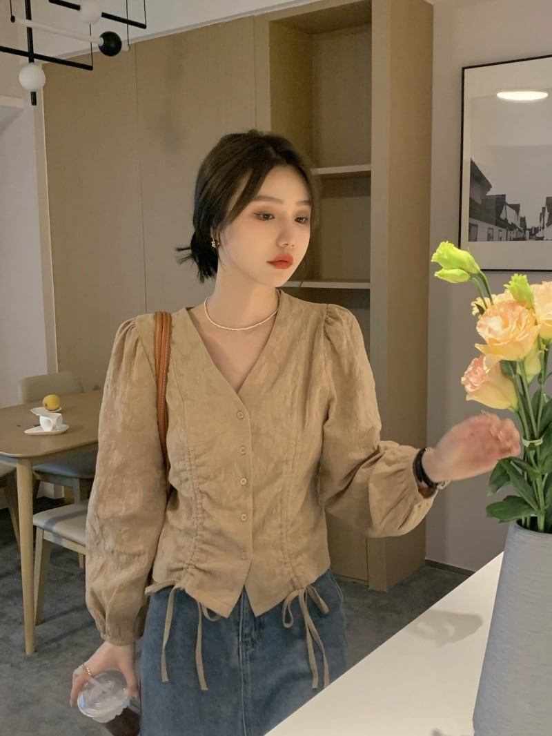Vネックノーカラー長袖ギャザーシャツブラウス。
