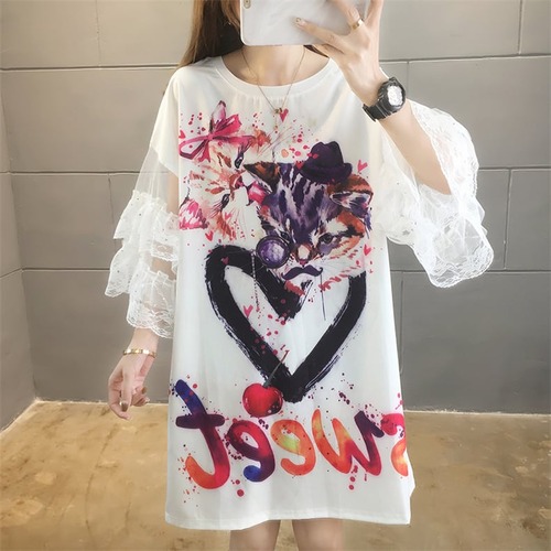 【送料無料】トップス Tシャツ レディース 半袖 l フリル 白 個性的 ロング 大人可愛い ゆるかじ かっこいい ユニーク ファッション ミディアム丈 春 夏 ホワイト 白 プリント ラウンドネック 大きいサイズ 薄手 ルーズ カジュアル かわいい おしゃれ キュート ガーリー ラブリー こなれ感 存在感 大人可愛い お洒落 抜け感 ラフ ゆる ゆったり M L XL 2XL 10代 20代 30代 休日 デート お出かけ 女子会 インスタ映え モテ コーデ 韓国 体型カバー 韓国系