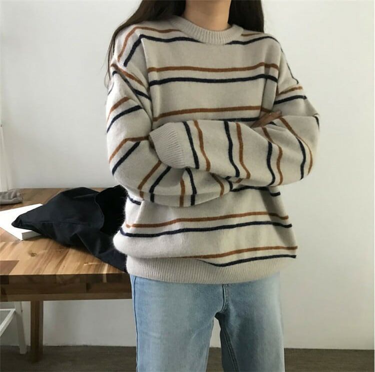 【送料無料】 トップス ニット セーター l ストライプ オーバーサイズ シンプル カジュアル 通学 学生 ゆったり ラウンドネック 長袖