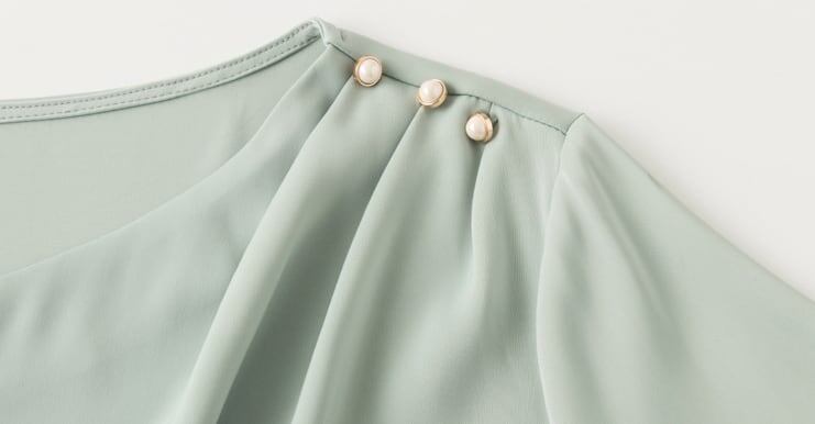 斜めにカットされた襟口のデザインが印象的な半袖サテンブラウス。