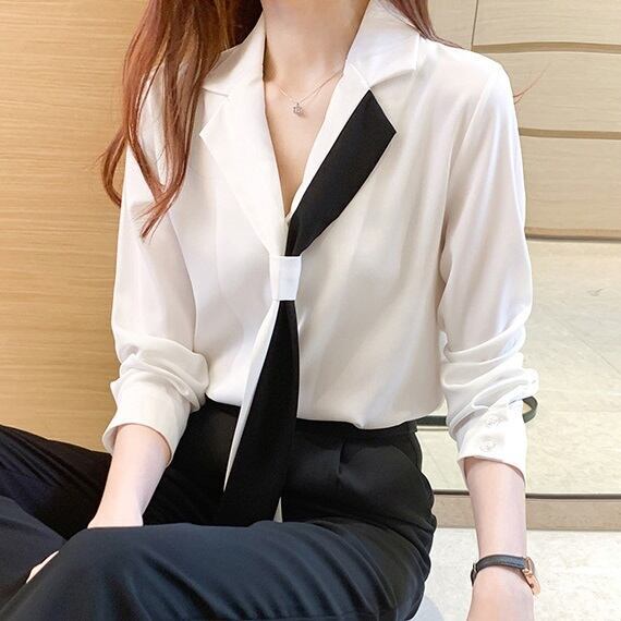 【送料無料】 トップス シャツ ブラウス l 襟付き 開襟 Vネック バイカラー 配色 コントラストカラー シフォン シック シンプル 無地 長袖 袖あり スーツ襟 おしゃれ お洒落 大人女子 通勤 通学 OL オフィス 大人 おでかけ デート フォーマル 着回し レディース 春 秋 大きいサイズ S M L XL 2