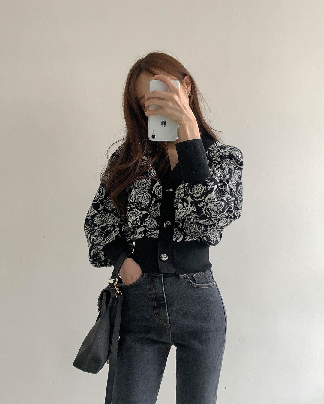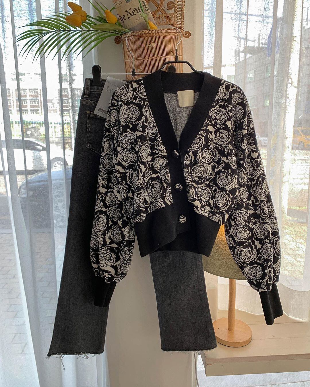 【送料無料】 レディースカーディガン Vネック 長袖 l 花柄 ローズ柄 ショート丈 リブ袖 トップス アウター 上着 羽織もの 春 秋 大人可愛い おしゃれ お洒落 大人女子 個性的 存在感 主役級 レトロ 古着風 通学 学生 大学生 キャンパスコーデ 休日 お出かけ 散歩 おうちコーデ 着回し 色違い 重ね着 お揃い 双子コーデ カラー ブラック ピンク サ