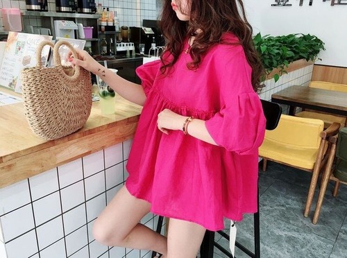 【送料無料】 トップス シャツ ブラウス l 麻 リネン コットン パフ袖 パフスリーブ 5分袖 袖あり チュニック丈 ギャザー 切り替え 裾フレア ラウンドネック 無地 シンプル 袖ゴム 伸縮性 ゆったり ふんわり ルーズ 体型カバー カジュアル 大人女子 大人可愛い かわいい 可愛い 通勤 通学 学生 デート 旅行 休日 普段着 普段使い 着回し レディース 10代 20代 夏 ワンサイズ ローズレッド ホワイト