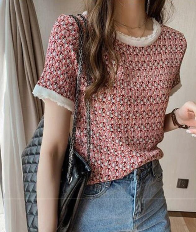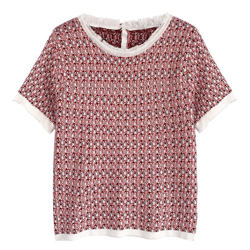 【送料無料】 トップス サマーニット 半袖 l ツイード風 柄 トリム デザイン ラウンドネック 背面ボタン 袖あり レディース ファッション 通勤 通学 学生 普段使い 着回し お出かけ デート 休日 大人女子 旅行 大人可愛い 可愛い かわいい おしゃれ お洒落 10代 20代 夏 S