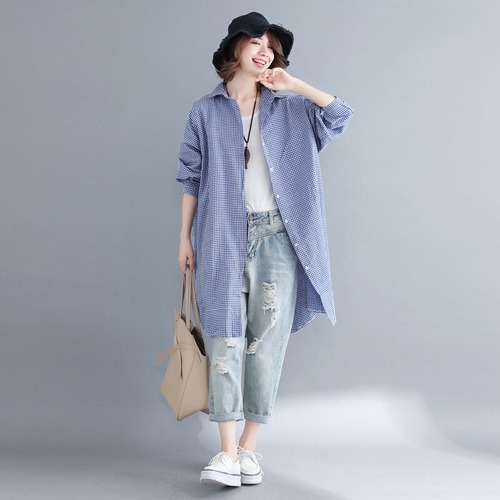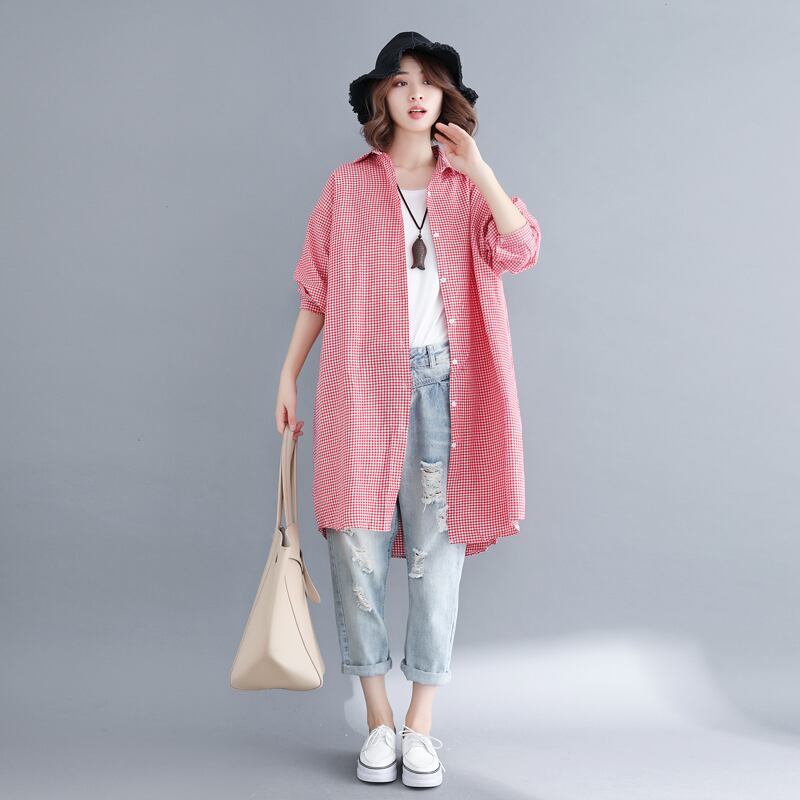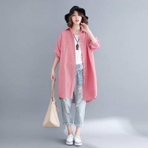 【送料無料】 シャツ トップス チェック柄 l ロングシャツ フロントボタン ボタン付き 襟付き ポロ襟 薄い 羽織 羽織り ロング丈 ミディアム オーバーサイズ ゆったり 大きめ 体型カバー カジュアル 大人 通勤 通学 お出かけ 普段着 普段使い 着回し 旅行 ママ マタニティ 公園デビュー 休日 旅行 レディース 女性用 ファッション ポリエステル 春 秋 ワンサイズ レッド 赤 ブル