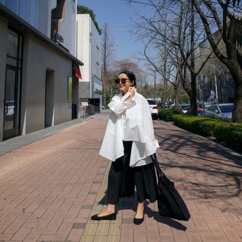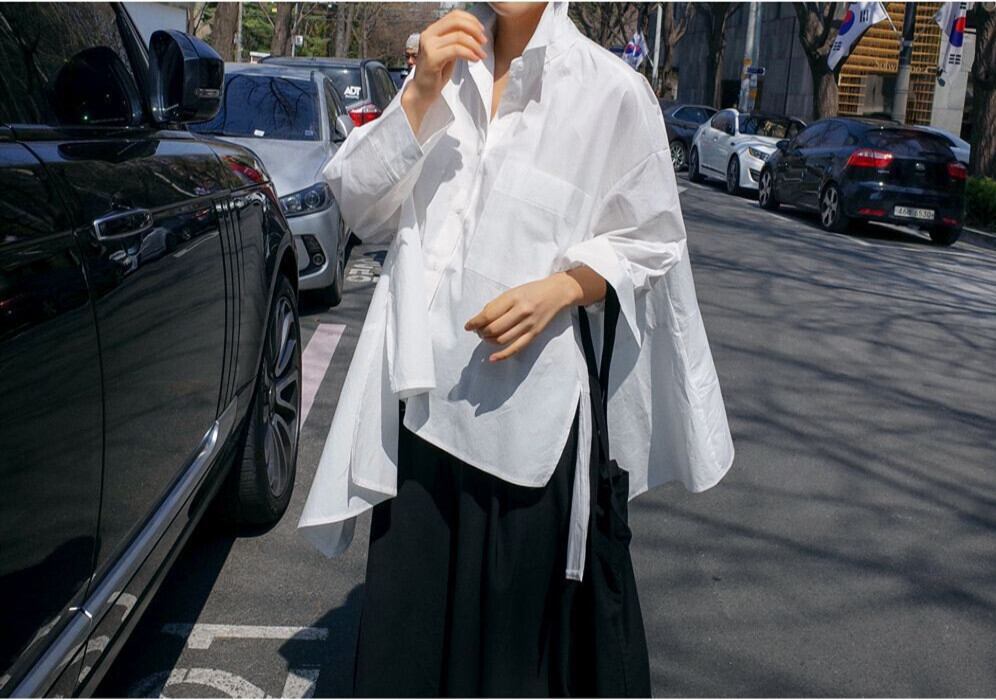 【送料無料】 長袖 シャツ バック l ルーズ ビッグサイズ アシンメトリー アシメ ブラウス ファッション カジュアル コットン 襟付き ポロ襟 ポケット付き ドロップショルダー ゆったり 普段着 普段使い 春 秋 S M L