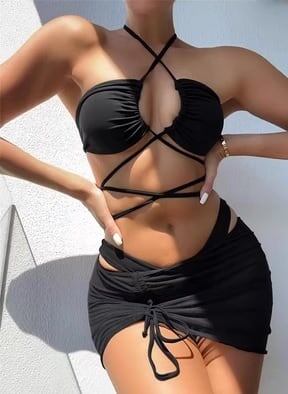 【あなたの夏を彩る、クロスホルターのビキニ♪】夏を彩る究極の1着、クロスホルターのビキニ!海やプール、ビーチで楽しめる、体型カバー効果抜群のスイムウェアです。韓国ファッションならではの無地デザインが、セクシーでありながらも上品な雰