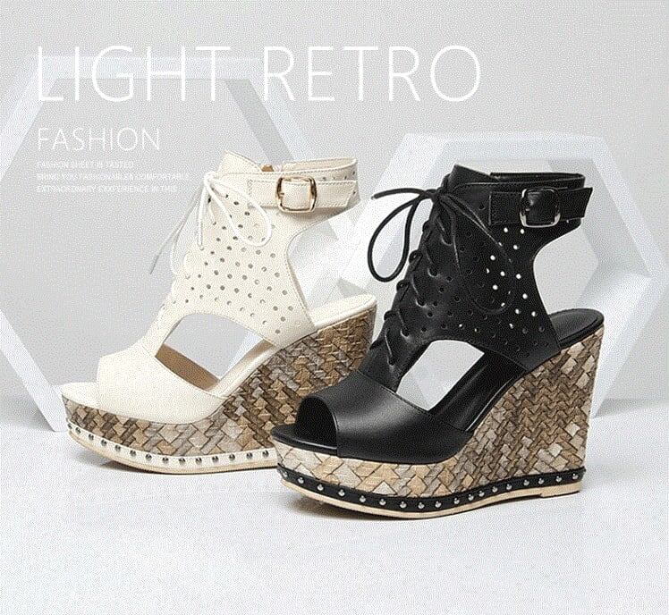 【大人可愛いサンダル&サマーブーツ!シンプルなレザー素材にストロー編み、レースアップ、ジッパー&ファスナー仕様、ウェッジソールで美脚効果抜群!11cmヒールで大人可愛い雰囲気が演出できる、通勤・通学・デート・旅行・女子会な