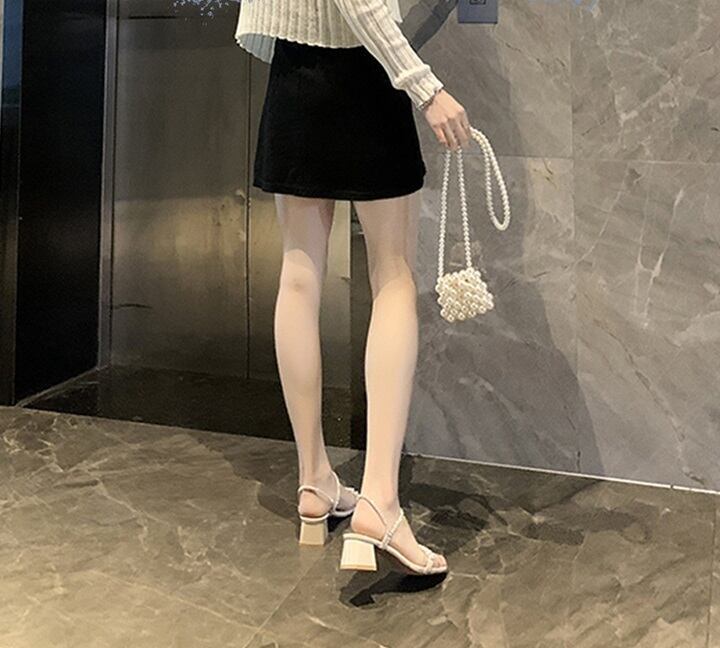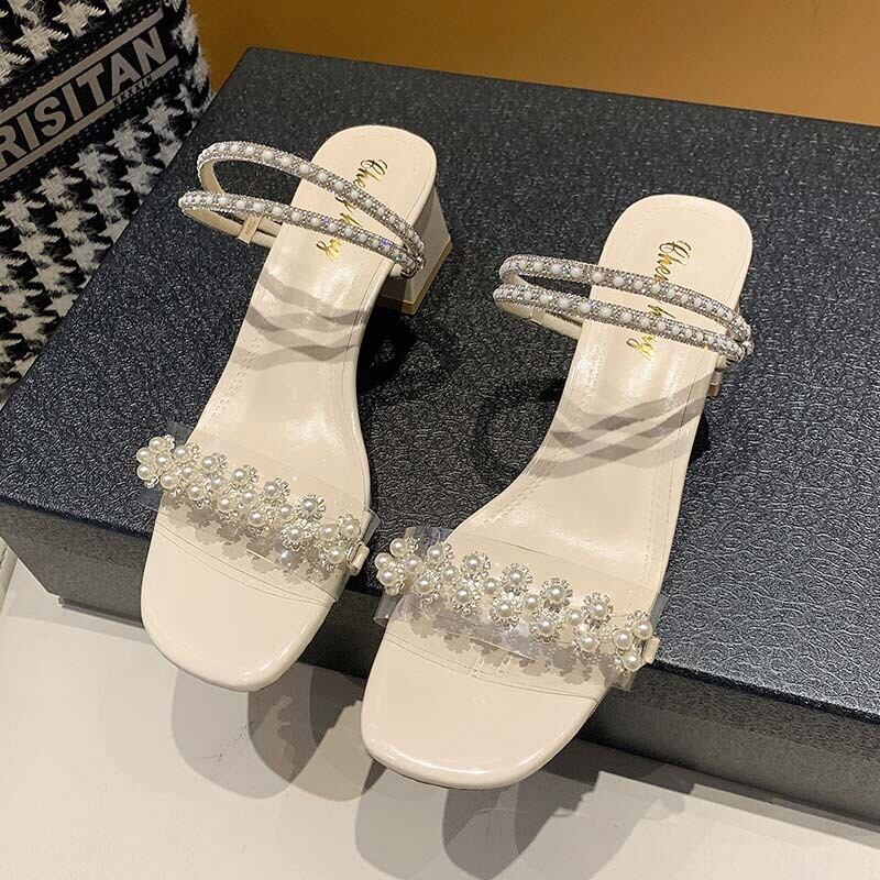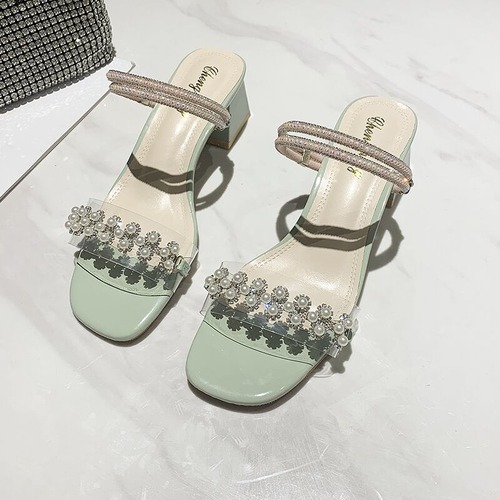 30代 40代 50代華やかさと可愛さを兼ね備えた、PUレザーのサンダルが登場!パールとラインストーンがキラキラと輝く、4.5cmのチャンキーヒールで存在感を放ち、スクエアトゥのオープントゥで履き心地も抜群!2wayで活用できるデザインなので、