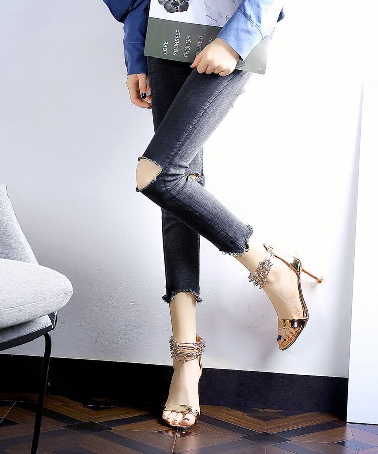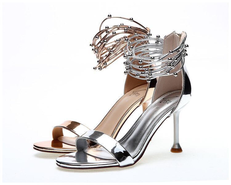 -25.0cm美脚を演出する脚長効果抜群!8cmヒールのビジューサンダルで、きれいめな大人可愛いスタイルを演出♪キラキラのレザーPUで、上品でエレガントな履き心地で、存在感抜群の主役級スタイルを演出!アンク