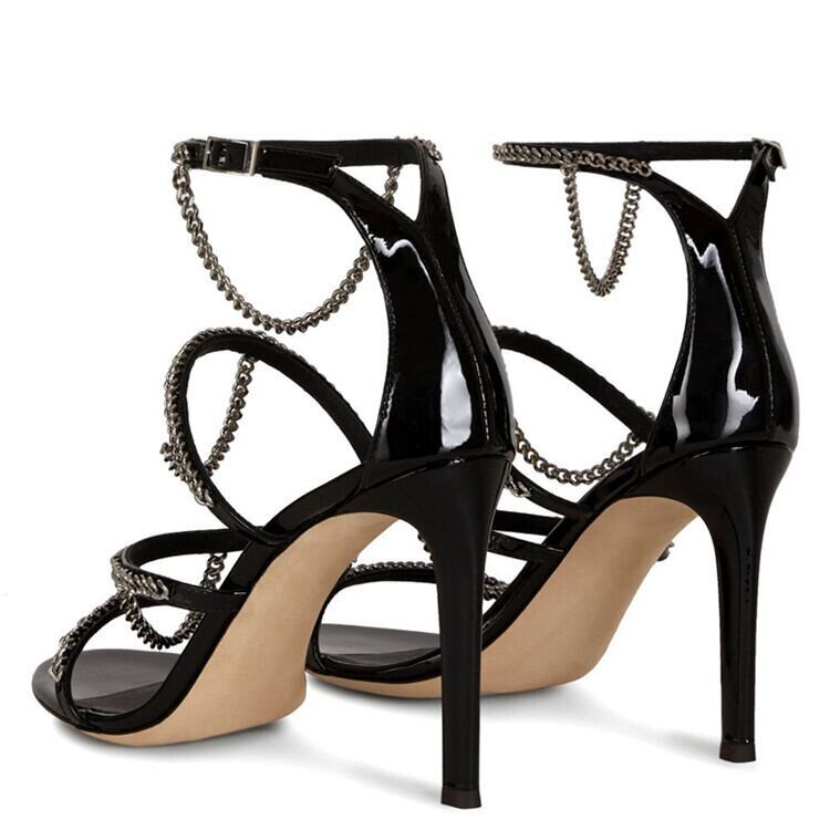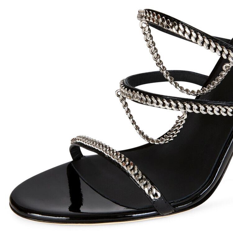 【送料無料】 チェーン ハイヒール サンダル l 靴 くつ 8.5cm 9.5cmヒール ピンヒール ラウンドトゥ ストラップ ベルト ビジュー キラキラ 美脚 脚長 レザー 大人可愛い きれいめ 上品 おしゃれ 個性的 春 夏 10代 20代 レディース 通勤 学生 通学 デート お出かけ 女子会 休日 パーティー 旅行 普段使い 小さいサイズ 大きいサイズ 21.5cm 22.0cm 22.5cm 23.0cm 23.5cm 24.0cm 24.5cm 25.0cm 色展開 黒 ブラック 銀色