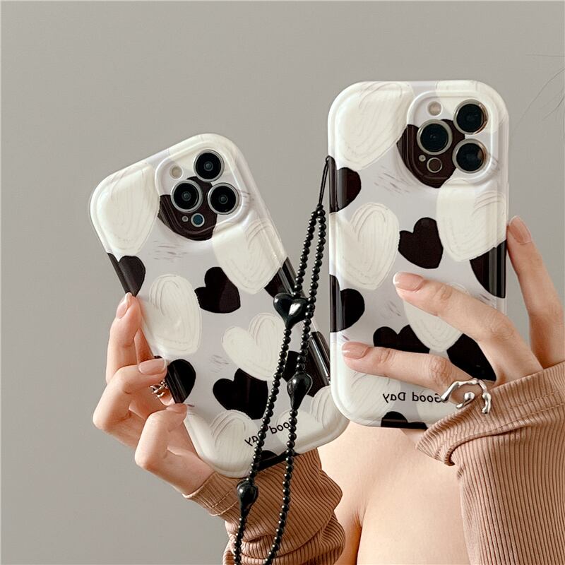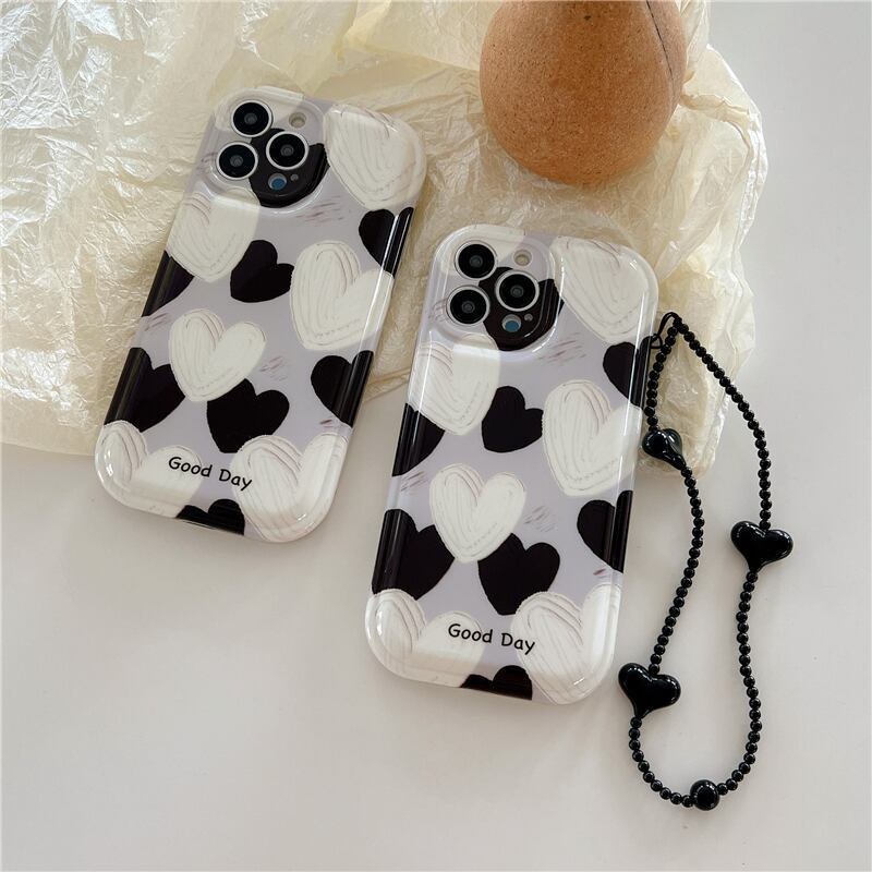 大人可愛いモノクロハート iPhoneケース!白黒のレトロなデザインが、シンプルながらも存在感を放ちます。ストラップ付きなので、持ち歩きも安心!スマートに、おしゃれに、あなたのスマホを可愛くカバーしましょう!