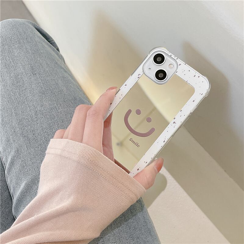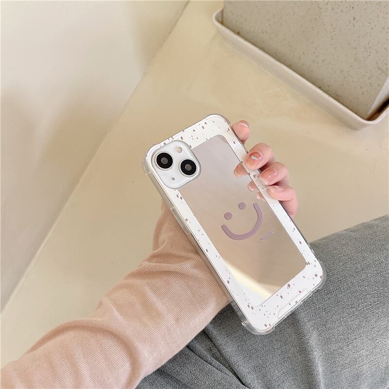 スマイル iPhoneケースで、レトロなモノトーンが魅力的な大人可愛いスマホケース。ミラー付きなので、鏡のように鏡面で自分のおしゃれをチェックできます!韓国っぽいロゴが付いたシンプルなデザインで、スマイルを表現しましょう!
