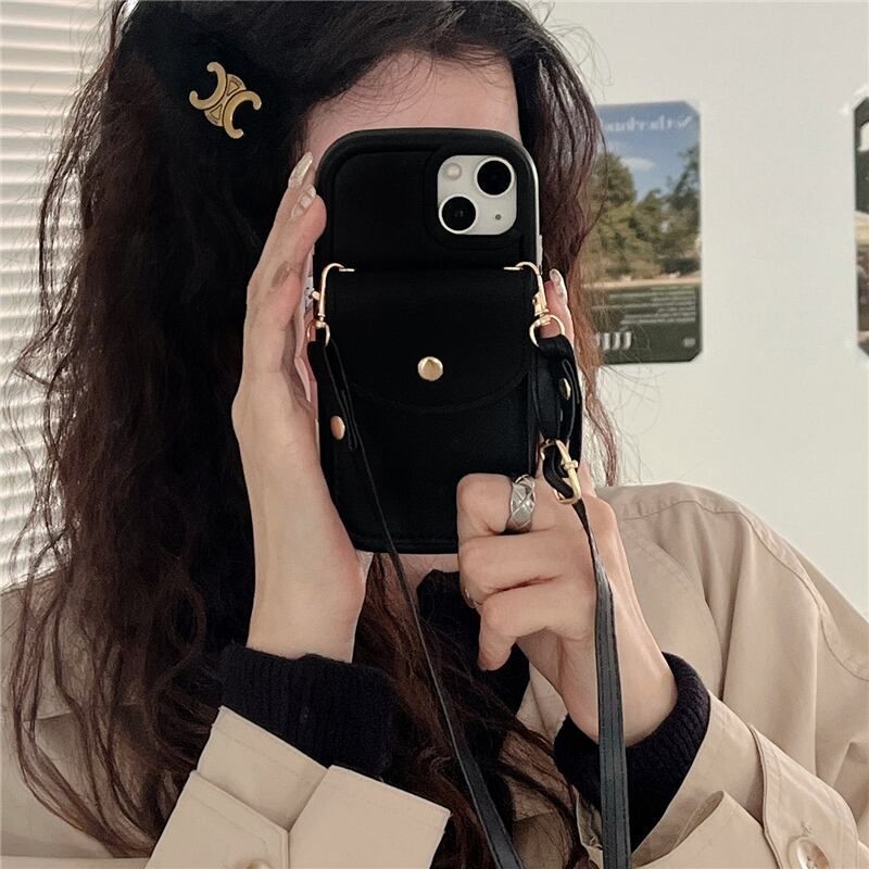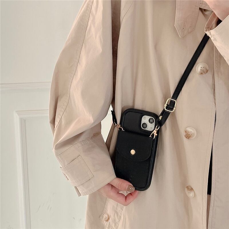 風 大人女子にもぴったりなiPhoneケース!ブラックのシンプルなデザインに、ショルダーストラップとカードケース付きで、落下防止にもなるシリコン素材で、クールな韓国風なスマホケースが登場!安心して使えるスタイリッシュなデザインで、おしゃれを楽