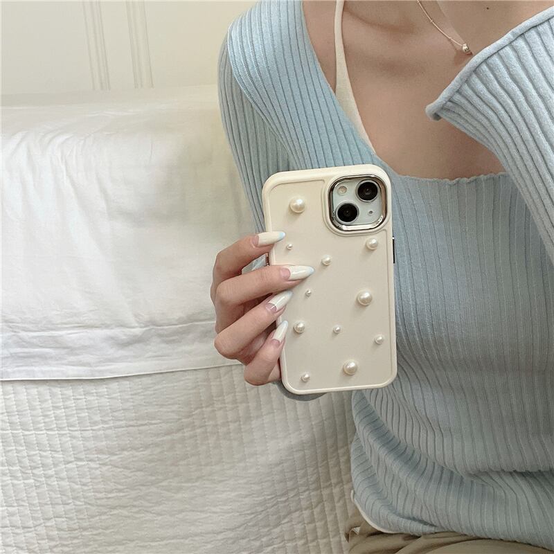 スタイルを演出する、パール立体のiPhoneケース 素材にパールを使用した立体的なデザインが特徴的なiPhoneケース。ブラックとホワイトの2色展開で、シンプルながらクールな印象を演出します。韓国のトレンドを取り入れたデザインが特徴で、スマホケースとし