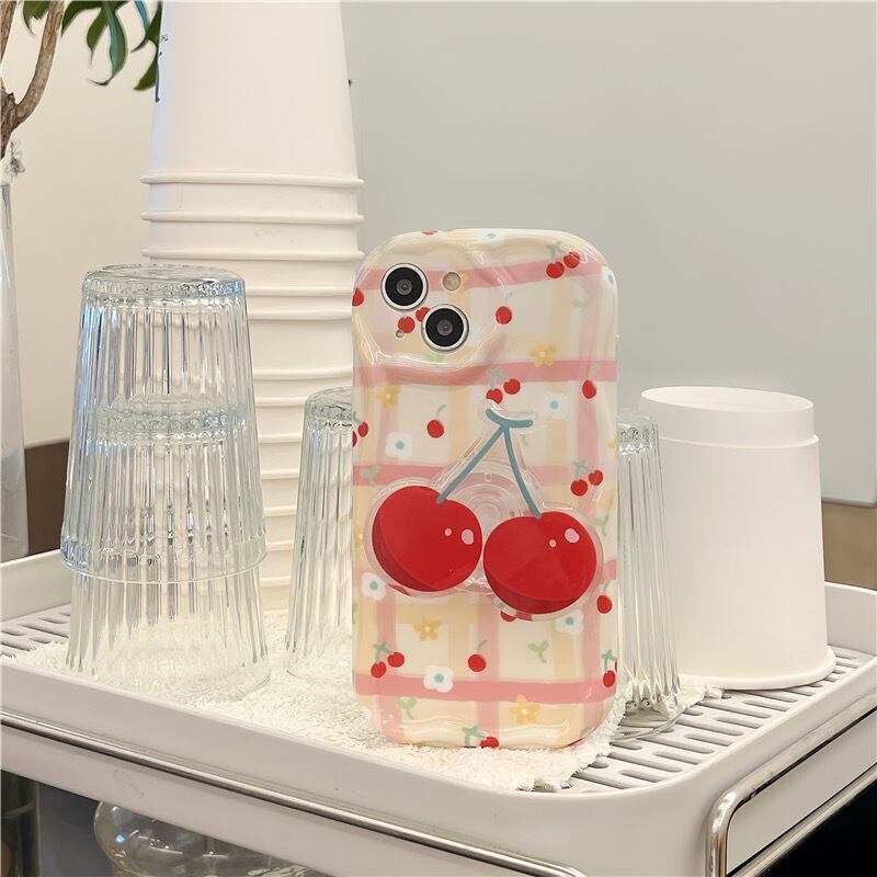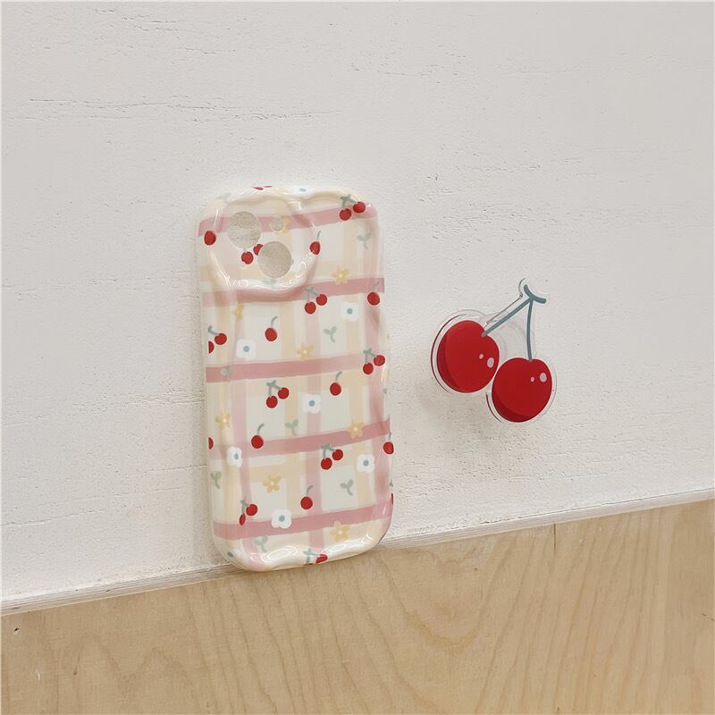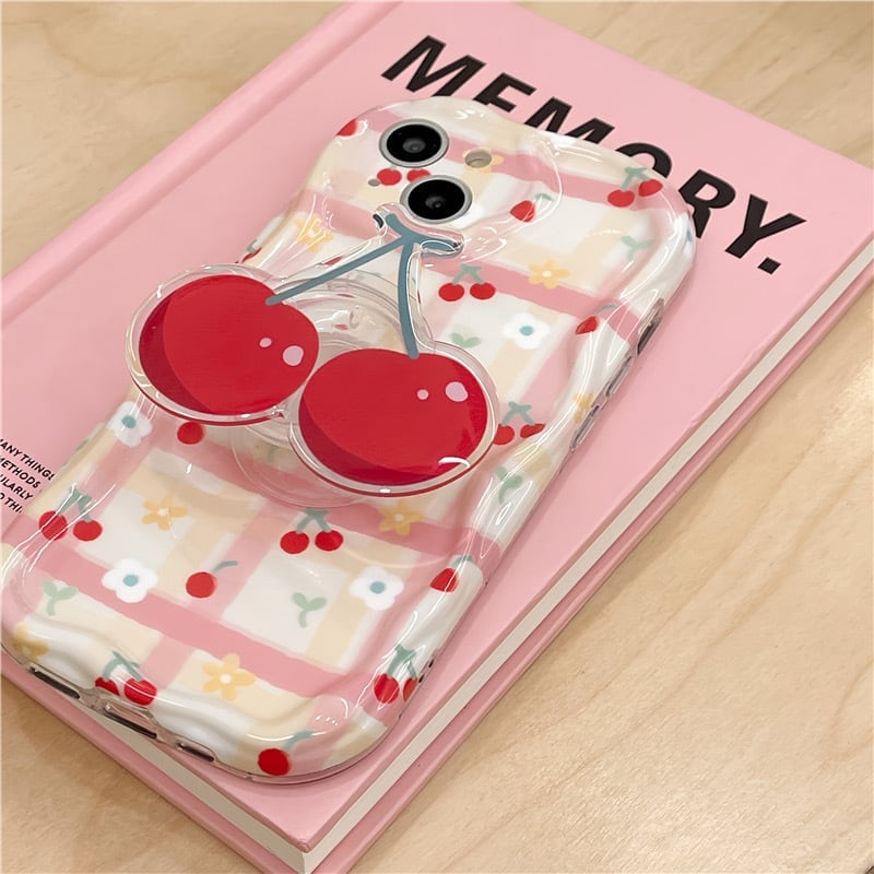 さくらんぼチェリーピンクのかわいいiPhoneケース!スタンド付きで、韓国風のキュートなフルーツ柄があなたのスマホを可愛く飾ります!