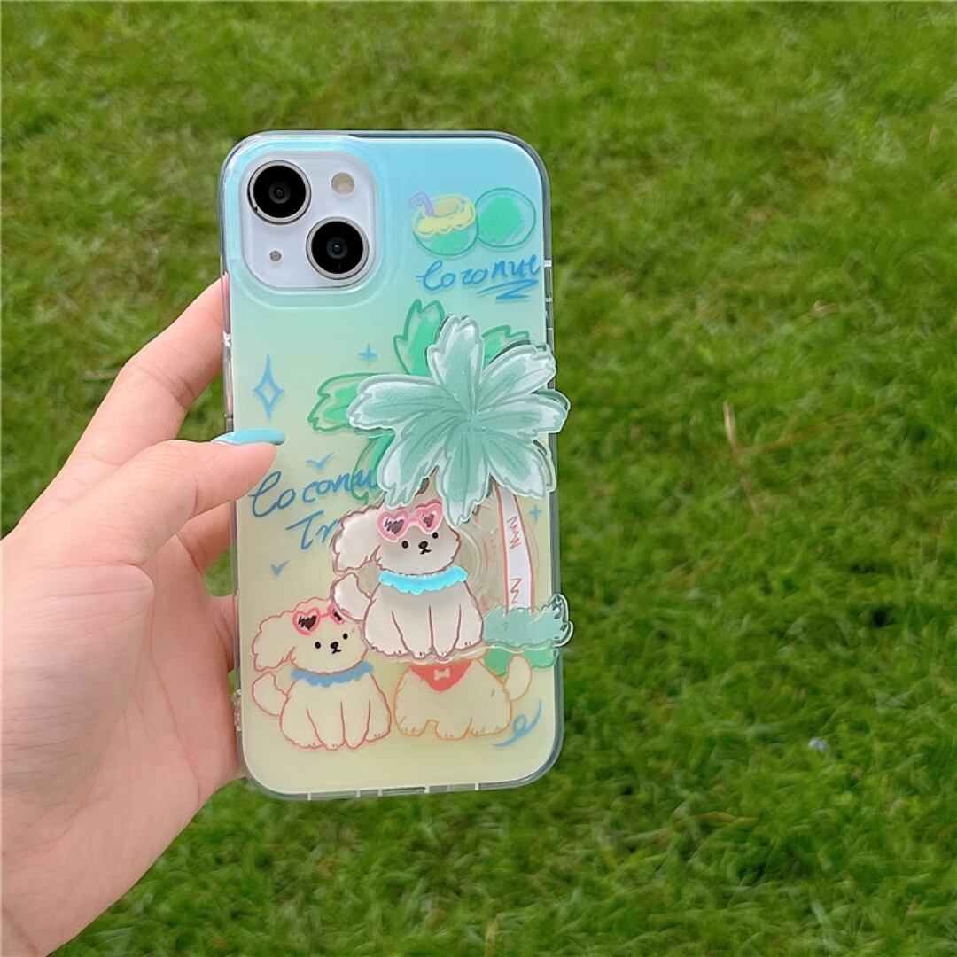 【送料無料】 iPhoneケース スマホケース カバー l 可愛い ソフトラバー 韓国 おしゃれ キュート 水色 スタンド 落下防止 夏 ココナッツの木 犬